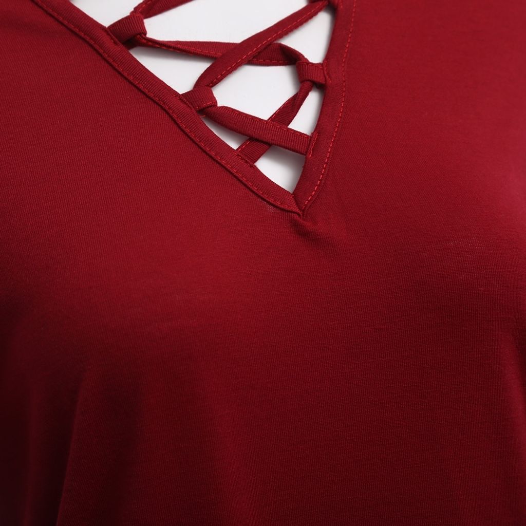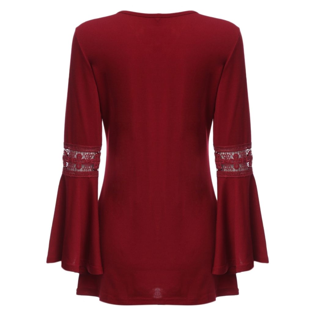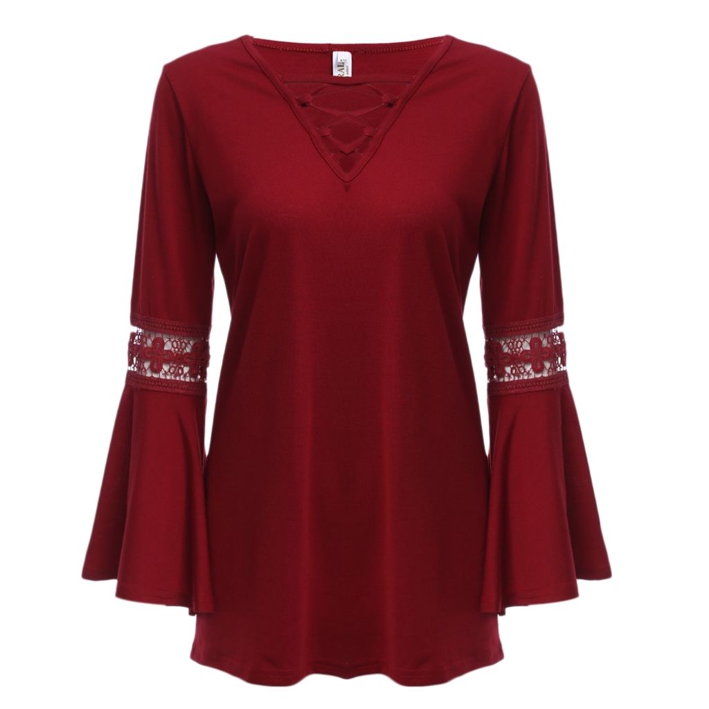 SEXY V-NECK CRISS-CROSS HOLLOW EMBROIDERY FLARE SLEEVE BLOUSE (WINE RED, SIZE M/L/XL)