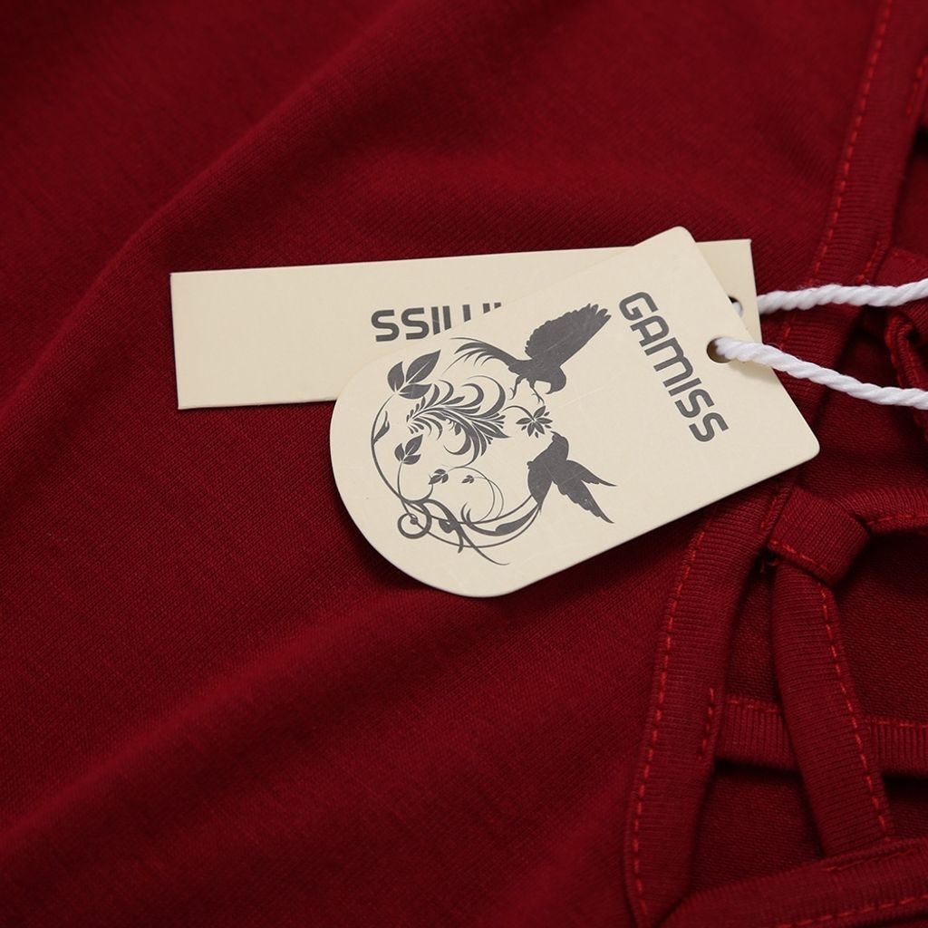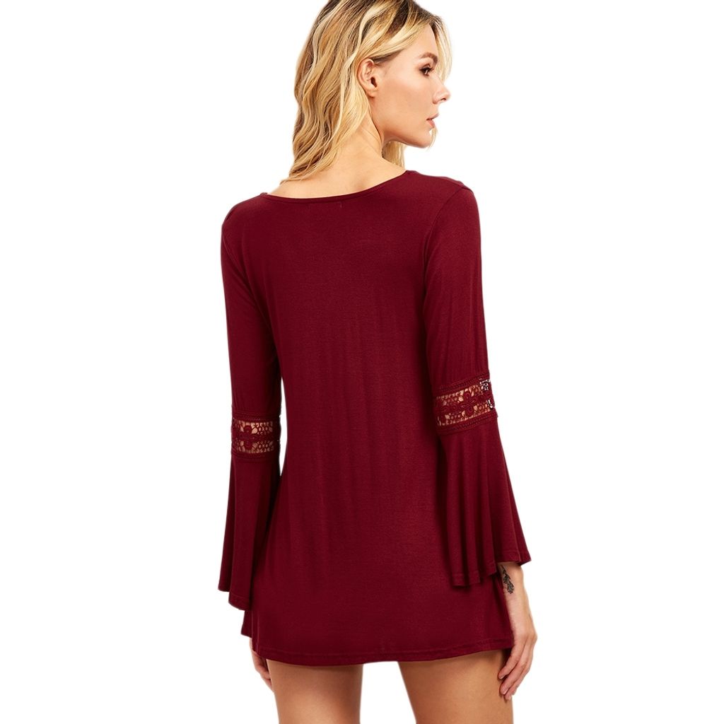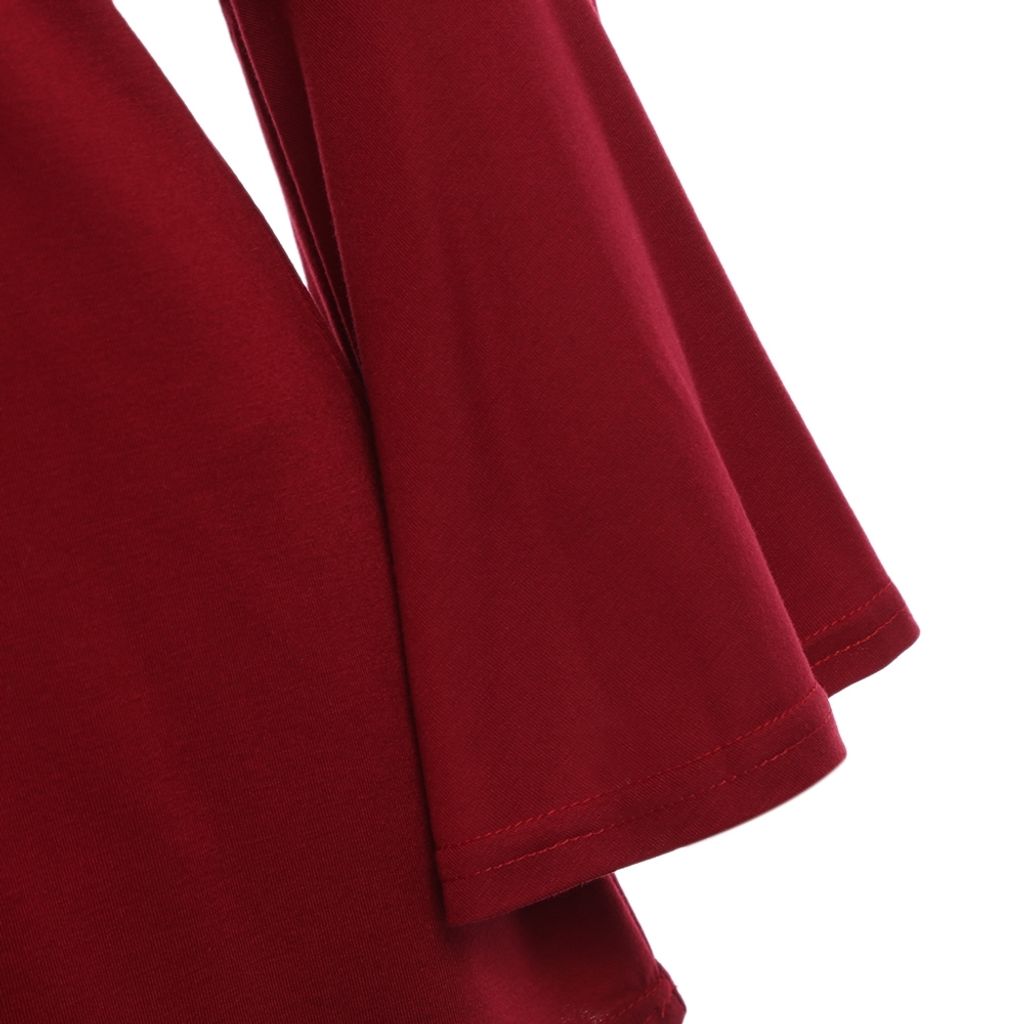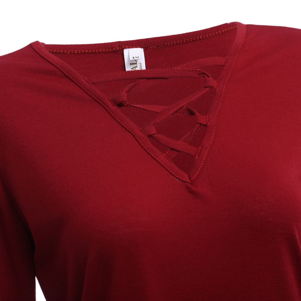 SEXY V-NECK CRISS-CROSS HOLLOW EMBROIDERY FLARE SLEEVE BLOUSE (WINE RED, SIZE M/L/XL)